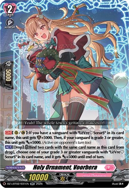 Description: [CONT](RC)/(GC)If you have a vanguard with "LèVreSœurS" in its card name, this unit gets [Shield]+5000. Then, if your vanguard is grade 3 or greater, this unit gets [Power]+5000. (Active on opponent's turn too)